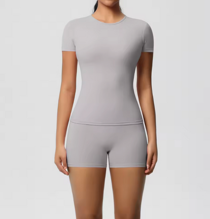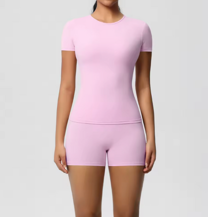 This 2-piece summer active set features a breathable, quick-drying short-sleeve top paired with sculpting high-waist cycling shorts. Designed with lightweight, stretchy fabric, it keeps you comfortable through intense workouts, yoga sessions, cycling, or everyday movement. Sleek, versatile, and performance-ready: your warm-weather go-to for fitness and style.